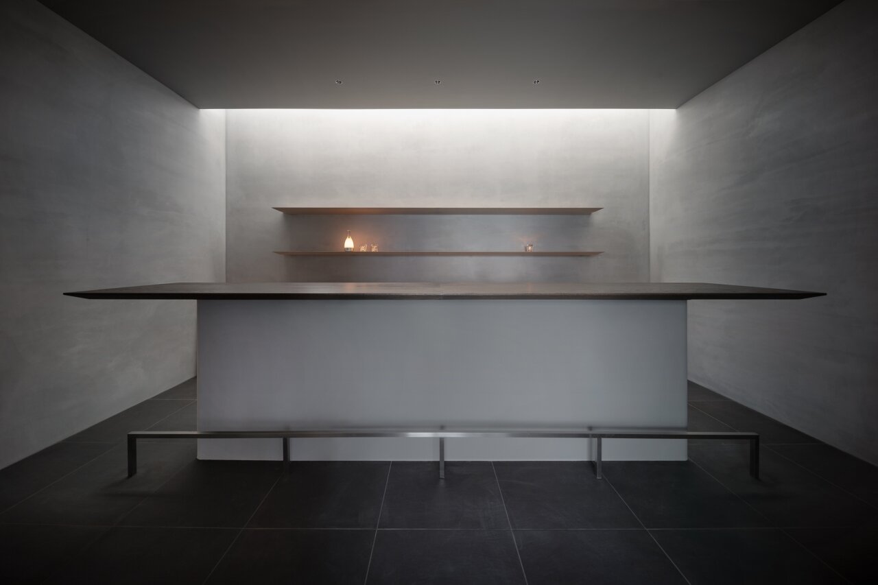 ハイカウンターの腰壁は、のフラットラフ仕上げ。塗厚1㎜と薄塗りながら強度と左官の風合いを併せ持つ素材です。